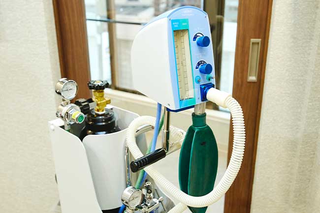 笑気麻酔:笑気はリラックスした状態で治療を受けられます。また、酸素は緊急時に投与したりして患者様の体を守ります。